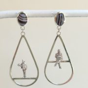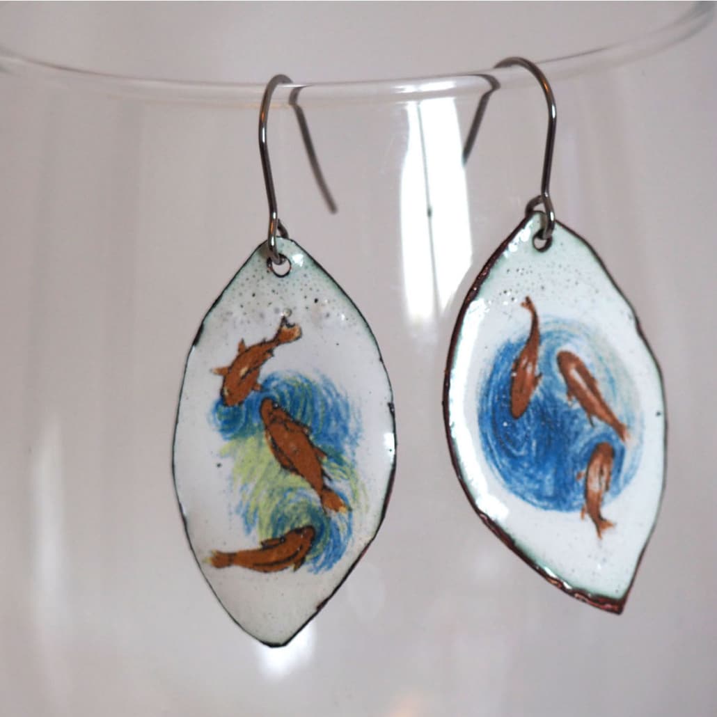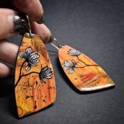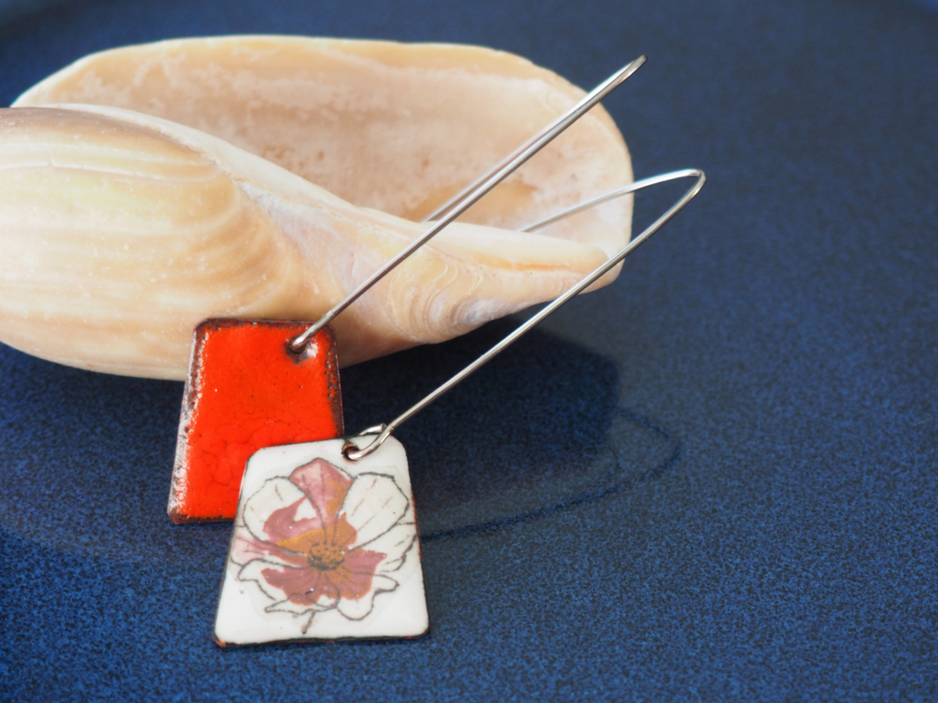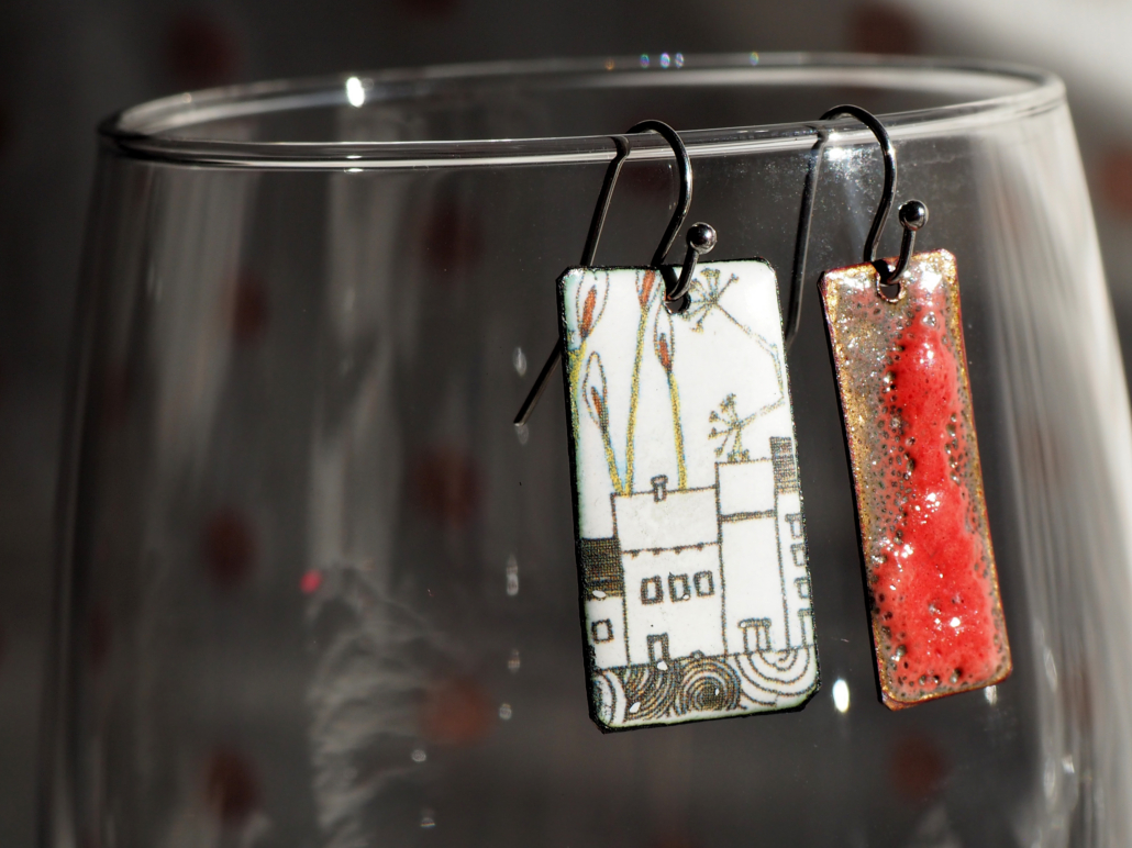 Je travaille à partir des dessins que je fais, sur des bagues, broches, boucles d’oreilles, en émail sur cuivre.